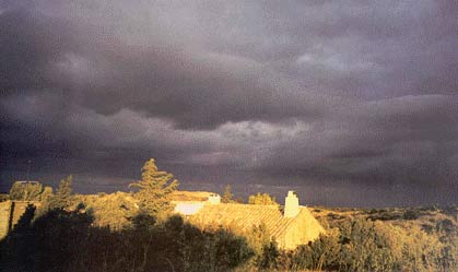 The thin veil of rain blocking out the mountains forming the invisible horizon line.