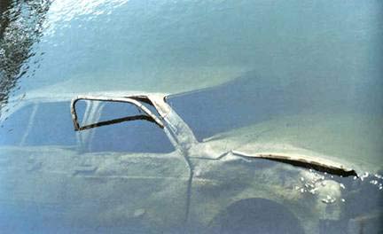 The bubbles emerging from under hood at lower right as representing some kind of last gasp of the car, or perhaps even the civilization that brought such a beautiful catastrophe into existence.